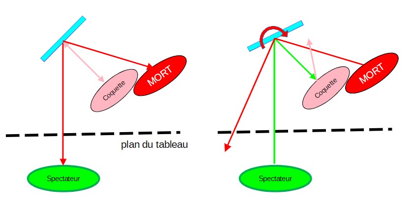 S’y ajoute un effet d’écho (flèches rouge) entre les accessoires de la Coquette (les flacons et le miroir) et ceux de la Mort (le sablier et le crâne).