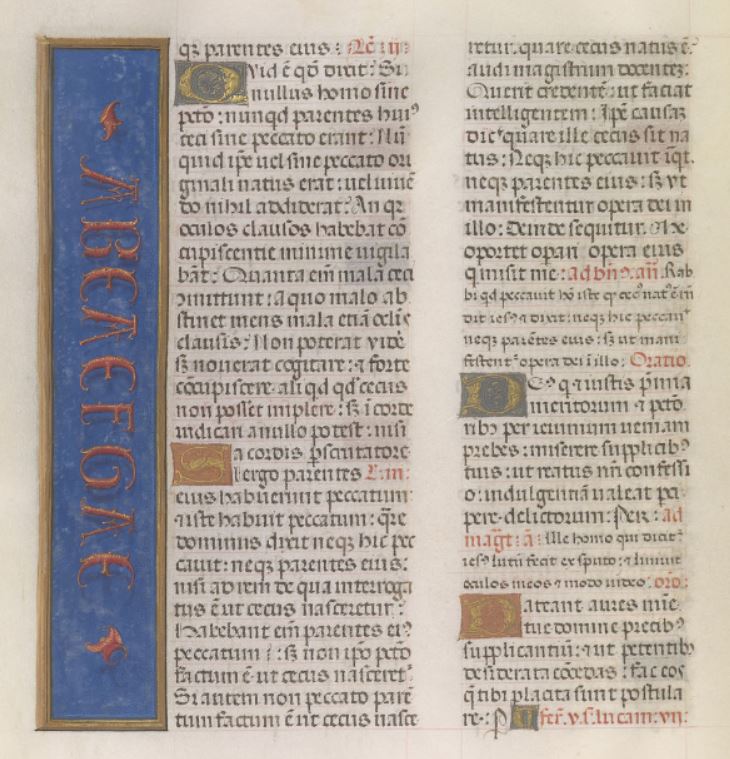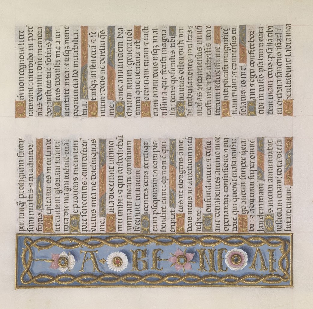 On trouve souvent dans les Livres d’Heures des représentations de l’alphabet, soit comme bordure décorative, soit comme micro-inscription sur un livre à l’intérieur du livre. Danièle Alexandre-Bidon [2] a montré que ces alphabets intégrés servaient à l’apprentissage de la lecture.