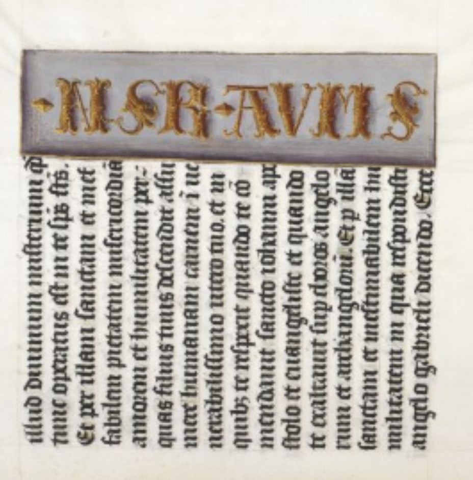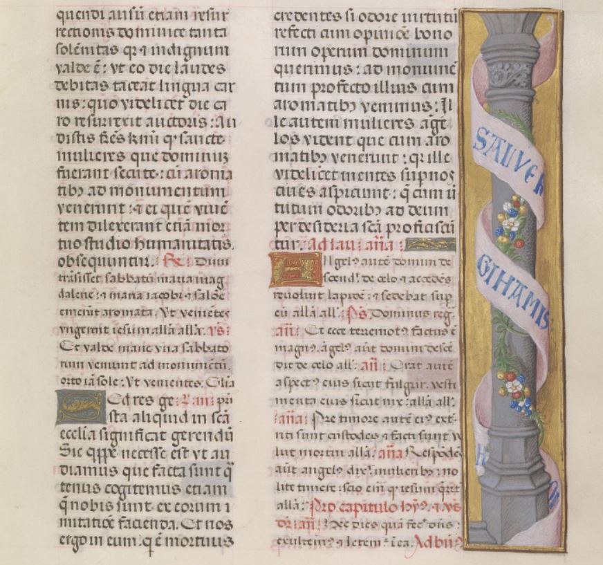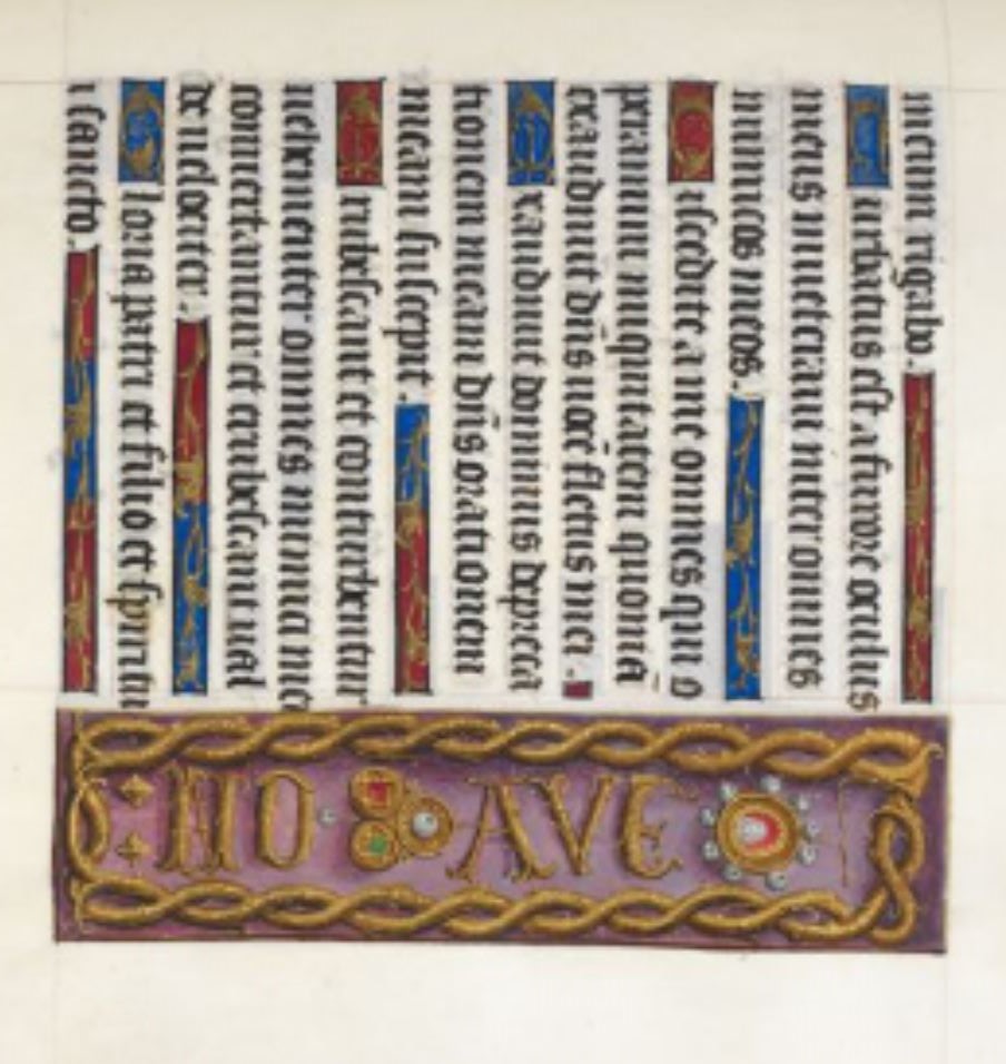 - la bordure de la page de gauche porte une prière parfaitement lisible, qui s’interrompt abruptement : Salve , sancta Parens , enixa puerpera Regem q…