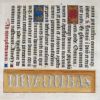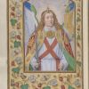Ce deuxième livre d’Heures semble légèrement postérieur au précédent. C’est un séraphin apocalyptique bleu qui, à la place du Lion rouge, tient le Livre aux Sept Sceaux. On retrouve le même fond biparti, semé maintenant de noeuds dorés.