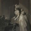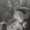 En rentrant chez elle (la cape jetée sur la table), la dame a trouvé une lettre de rupture. De rage elle piétine le portrait de l’amant et arrache son médaillon qu’elle portait au cou. Mais par la porte de droite la servante, l’esprit pratique, amène l’écritoire pour raccommoder les choses.