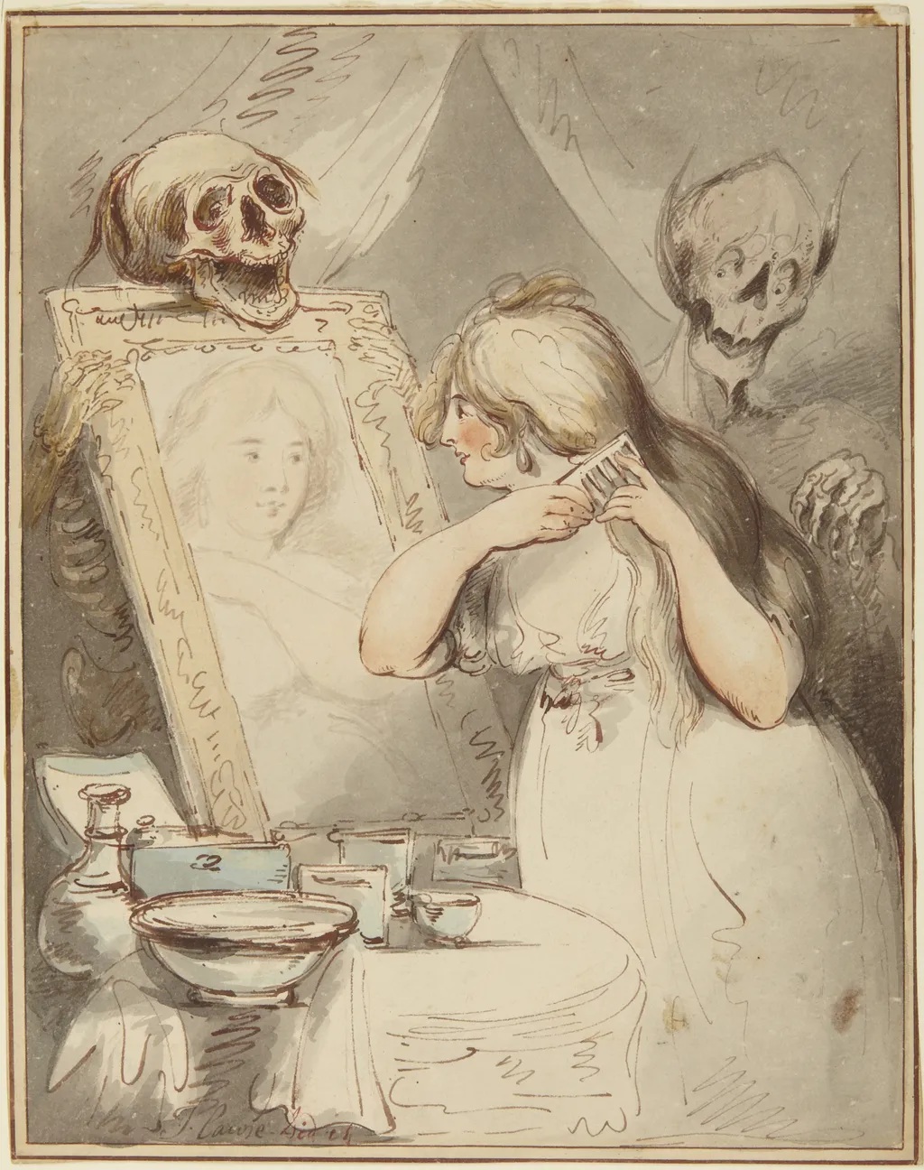 Le miroir évoque la Luxure, et le crâne évoque la Raison qui permet de la dominer (par la conscience de la mort).