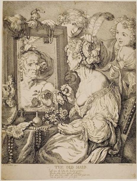 Dans la petite pièce, à côté du feu allumé et du chat, un personnage en long manteau noir se regarde lui-aussi dans un miroir. Certains y voient un homme ([2a], p 628), d’autres une femme, d’après la longueur des cheveux. Pour Laura Gelfand ( [2b], p 245), il pourrait s’agir d’une servante qui, par contagion avec sa maîtresse, se voit frappée du même vice.