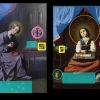 Notons que les trois scènes ne se déroulent pas dans une pièce ordinaire, mais dans un espace sacré : colonne et abside pour la première, lourd vase orné de têtes d’angelots dorés pour la deuxième, colonne et même vase pour la troisième.