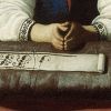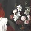 Elle repose sa tête d’enfant sur sa main gauche, dans la posture méditative traditionnelle recommandée en 1603 par Cesare Ripa dans son Iconologia. Au Moyen Âge, cette posture était interprétée comme l’expression d’une « attention aux inspirations de la vie intérieure ». Les autres représentations de la Vierge Marie par le peintre d’Estrémadure illustrent les moments partagés entre broderie et prière extatique, mais ici, seul le ravissement de l’amour divin est dépeint. Le symbolisme des fleurs dans le bol en porcelaine chinoise nous aide à mieux comprendre la signification profonde de cette œuvre exquise : le lys représente l’innocence et la pureté, les roses rouges l’amour et les œillets la piété filiale.