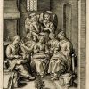 Une source possible est cette gravure, où on retrouve le bouquet, le panier à linge et deux anges au dessus de la Vierge, formant un triangles d’auréoles. Cette gravure a pour mérite de nous montrer deux utilisations du coussin à coudre posé sur les genoux : la Vierge l’a enveloppé avec le linge qu’elle est en train de repriser (le rideau du Temple ?), tandis que sa compagne de gauche a déroulé sur le sien la bande qu’elle est en train de broder.