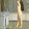 Dans cette confrontation hiératique, le rectangle du papier peint rapproche graphiquement des formes homologues : les pieds de la table et les jambes de la modèle, la cuvette et le bassin, l’eau invisible et l’écoulement irrépressible de la chevelure.