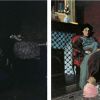 La première composition enferme le corps nu dans le cadre de la cheminée, tandis qu’un fouillis de vêtement prend possession du fauteuil de droite.