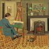 Réalisée la même année, cette toile chaude creuse le thème dans la direction opposée : en robe rouge, Frédérique Tison, muse au nom prédestiné, se réchauffe et s’instruit auprès de ces trois initiateurs que sont les gros volumes sur la table, les mystères de la cheminée, et le Peintre réduit au veston.