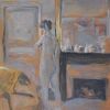 Devant la cheminée que nous connaissons bien, une femme nue rajuste son chignon en se regardant dans le miroir, tandis que sa compagne, vêtue et assise par terre, tient entre ses mains un tissu jaune, peut être un jupon. Elle ne la fait pas sécher devant le poêle allumé, et sa compagne semble attirée plus par le miroir que par la chaleur, de sorte que, narrativement, la scène n’a guère de sens. Plastiquement, le montant vertical de la fenêtre sépare la femme nue, qui se déploie à côté d’un grand mur blanc, et la femme habillée, qui se ratatine sous un bouquet de fleur multicolores. Enfin, humoristiquement, on constate que l’anglaise longiligne supplante la Vénus en plâtre, comme si la femme moderne éclipsait la Beauté classique. Mais tout cela ne nous mène pas loin.
