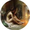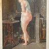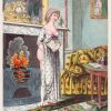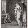 La femme reprend, devant la cheminée, la pose qui avait valu à La Frileuse d’être refusé au Salon de 1783. Plusieurs toiles similaires, de petit format, montrent également une femme nue debout, dans différentes activités. On en a tiré une série de dix gravures, visiblement conçues pour permettre la composition de séries et de pendants [15b] :