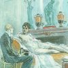 - dans l’esquisse au lavis, les deux statues posées sur le manteau suggèrent d’imaginer la femme nue, et de voir dans cette robe extravagante ce qu’elle symbolise vraiment : un sexe féminin de la taille d’une cheminée ;