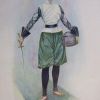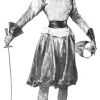 « Mais le costume ? – En bien, c’est la chose la plus simple au monde. Une jupe paysanne à plis qui couvre les chevilles tout en laissant le pied libre, un chemisier confortable (le corsage passé sans serrer). un plastron de papier mâché recouvert de cuir, masque, gants, arme, et le costume est fait.